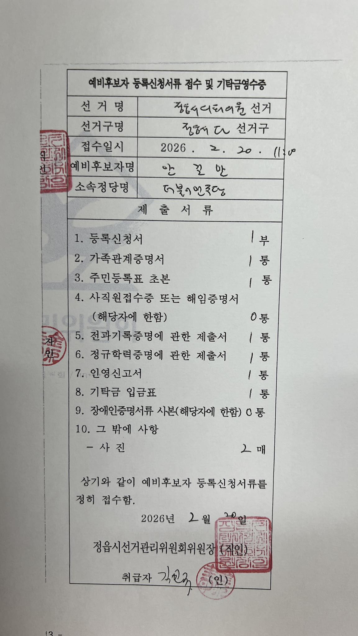 오늘(2월20일) 2026년 6월 3일 정읍지방선거 다선거구(연지.농소.입암.소성)출마를 위해 예비후보자 서류 접수를 오늘 하…